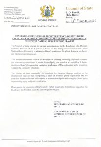The Council of State has issued a strong message of congratulations to John Dramani Mahama following the successful passage of a landmark resolution at the United Nations General Assembly declaring slavery and the transatlantic slave trade as crimes against humanity.