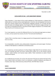 Accra Hearts of Oak Sporting Club, Ghana’s oldest surviving football institution,proudly commemorates its 114th anniversary with a heartfelt anniversary statement today, November 11, 2025—a date etched in the hearts of millions of Phobians across the globe.