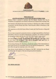 Asante Kotoko SC have officially announced a newly constituted Board of Directors following appointments made by Otumfuo Osei Tutu II.