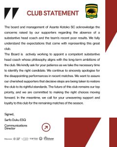 In a gesture of accountability and humility, the statement extends a sincere apology to the loyal fans for the subpar displays witnessed in several recent encounters. The club admits that results have fallen short of the standards expected from a side with Asante Kotoko’s pedigree, where every match carries the weight of immense history and expectation.