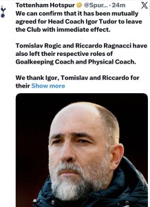 Tottenham Hotspur have sacked Igor Tudor after an extremely brief and disappointing spell in charge, bringing his ill-fated tenure at the club to an end after just seven games, the club has announced.