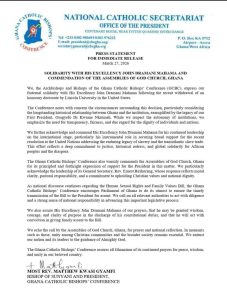 The statement was signed by Most Rev. Matthew Kwasi Gyamfi, President of the Ghana Catholic Bishops’ Conference.