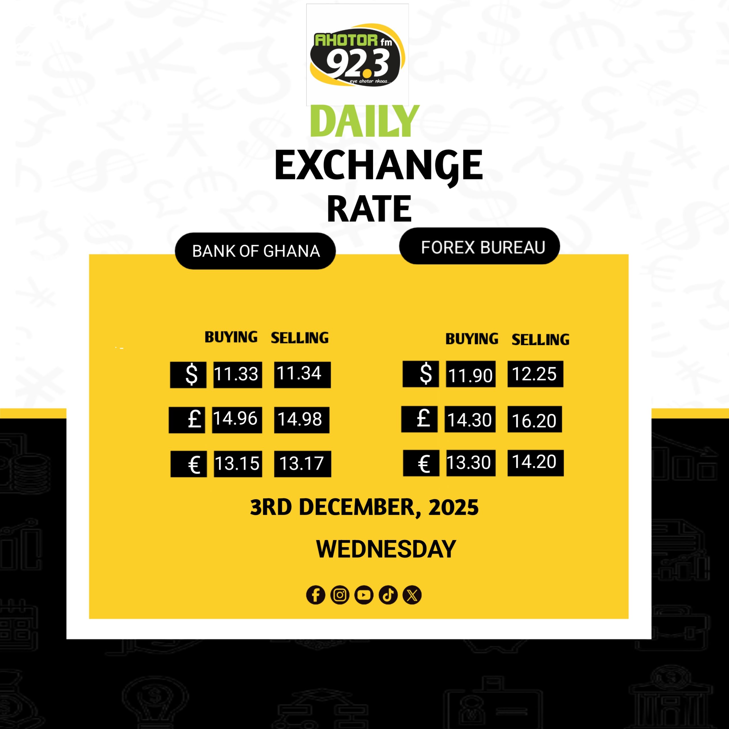 Dollar – Buying at GH₵11.33, selling price of GH₵11.34.