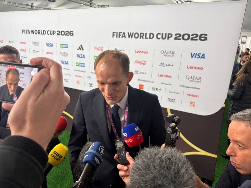 England manager Thomas Tuchel faced the cameras moments after the FIFA World Cup 2026 group-stage draw in Washington DC on 5 December 2025, reacting live as the Three Lions were placed in Group L alongside Croatia, Ghana, and Panama.