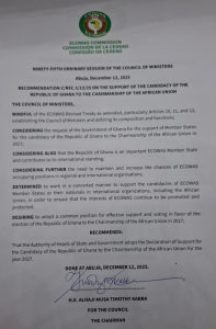 The ECOWAS Council of Ministers meeting at meeting in Abuja, Nigeria, has unanimously endorsed President John Dramani Mahama of Ghana as the sole candidate from ECOWAS for chairperson of the African Union when the rotating chairmanship gets to West Africa’s turn in 2027.