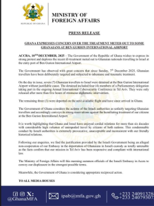 In a sharply critical statement, the Ministry of Foreign Affairs said seven Ghanaian citizens were detained upon arrival in Tel Aviv on Sunday, December 7, without any valid explanation from Israeli authorities.