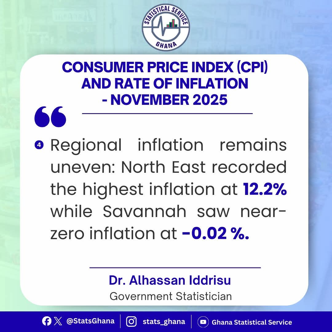 Regionally, the North East Region experienced the highest inflation rate at 12.3%, whereas the Savannah Region recorded the lowest at -0.02%.