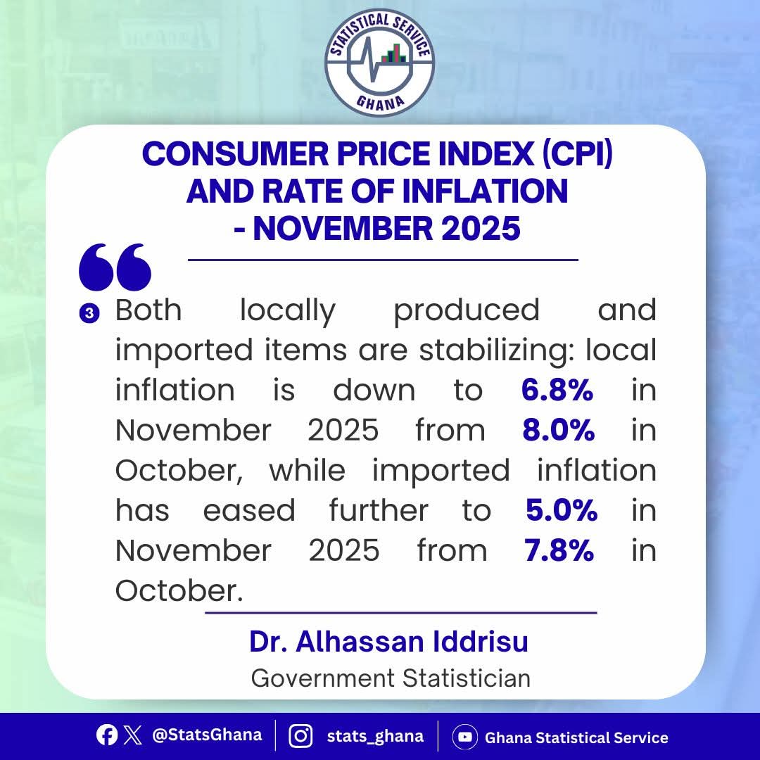 Ghana’s inflation rate has fallen for the eleventh consecutive month, easing to 6.3% in November 2025 from 8.0% in October, according to the Ghana Statistical Service’s latest Consumer Price Index (CPI) report.