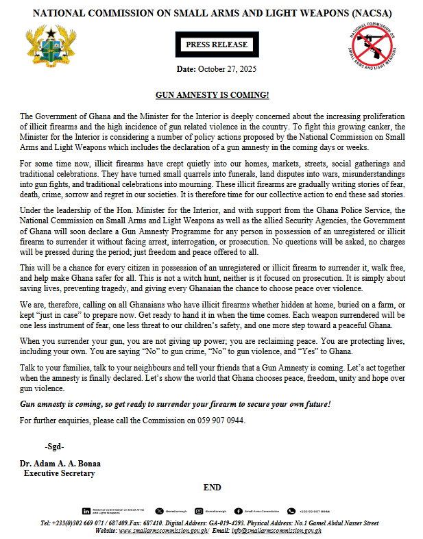 NACSA called on all citizens who possess hidden, buried, or stored unregistered firearms to prepare to hand them over once the amnesty begins. Each surrendered weapon represents “one less instrument of fear and one more step toward a peaceful Ghana.”
