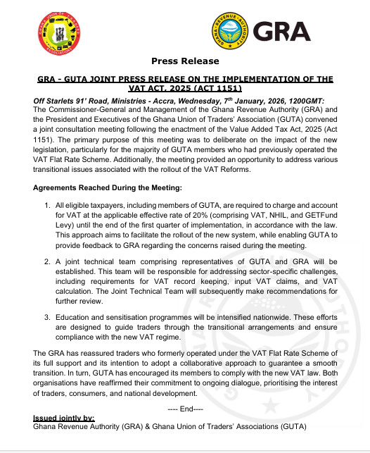 The Ghana Revenue Authority (GRA) and the Ghana Union of Traders’ Association (GUTA) released a joint communiqué today, detailing a collaborative plan to roll out the Value Added Tax Act, 2025 (Act 1151). The agreement emerged from high-level talks held Wednesday, January 7, 2026, at GRA headquarters in Accra’s Ministries area. These discussions tackled traders’ concerns over shifting from the abolished VAT Flat Rate Scheme to a standard VAT system.