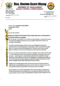 MP Kwame Asare Obeng, popularly known as A-Plus, has petitioned Speaker Alban Bagbin to remove Abena Osei Asare as Chairperson of the Public Accounts Committee (PAC). A-Plus argues that Abena Osei Asare’s previous role as Deputy Minister of Finance compromises the committee’s credibility and impartiality.