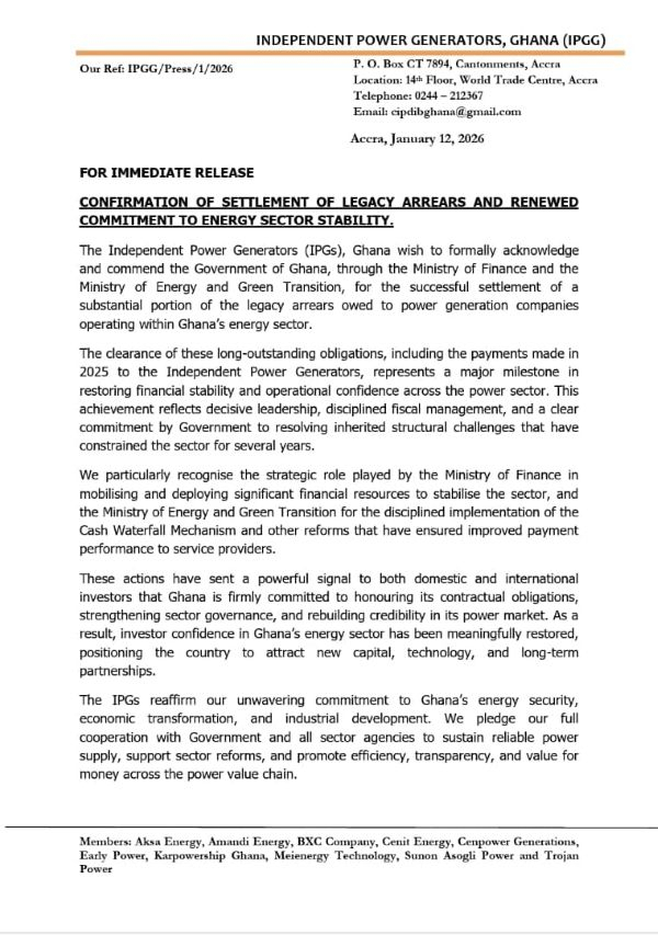 “We are confident this collaborative approach to resolving legacy arrears will shape a Government-IPG partnership focused on energy sustainability, financial discipline, and shared prosperity for Ghanaians,” the statement concluded.