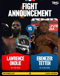 British heavyweight contender Lawrence Okolie (22-1, 16 KOs), a former WBO cruiserweight world champion of Nigerian descent, will face Ghanaian veteran Ebenezer Tetteh in a scheduled heavyweight bout on December 21, 2025, in Lagos, Nigeria.