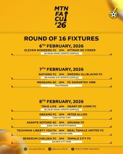 The MTN FA Cup 2025/26 (often referred to as ’26) in Ghana reaches the exciting Round of 16 this weekend, with knockout action spanning Friday, February 6 to Sunday, February 8, 2026. These single-elimination ties feature a mix of Ghana Premier League powerhouses, lower-division surprises, and potential upsets, as teams vie for quarterfinal spots (scheduled for March).