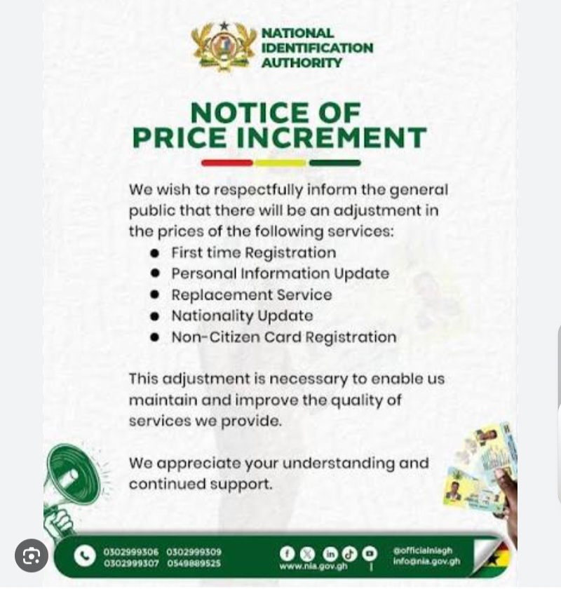 The National Identification Authority (NIA) has announced a price hike for several Ghana Card-related services.