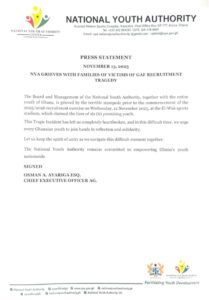 The National Youth Authority (NYA) has issued a press statement expressing grief and solidarity with the families of six young people who lost their lives in a tragic stampede at the El-Wak sports stadium on November 12, 2025, during a Ghana Armed Forces (GAF) recruitment exercise.