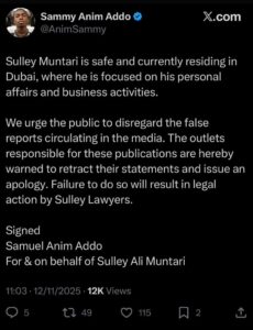 The clarification has drawn widespread attention online, with many fans expressing relief over Muntari’s well-being. The 2010 UEFA Champions League winner is reportedly doing well in Dubai, and Anim Addo’s swift response has put an end to the false reports.