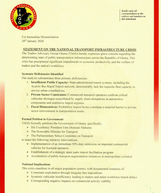 TAGG has petitioned President John Dramani Mahama, the Minister for Transport, and Parliament’s Select Committee on Transport for urgent action: duty waivers on commercial vehicle imports and a dedicated spare parts facilitation scheme.