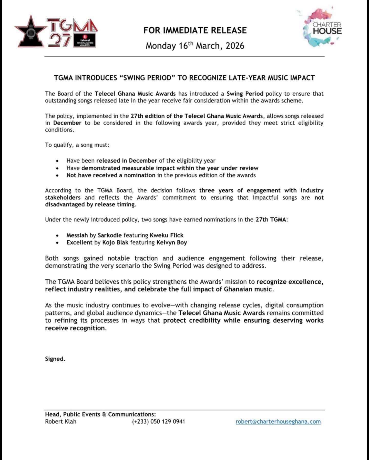 Organisers of the Telecel Ghana Music Awards (TGMA) have introduced a new “Swing Period” policy aimed at ensuring that songs released in December with strong public impact are not overlooked during the awards season.